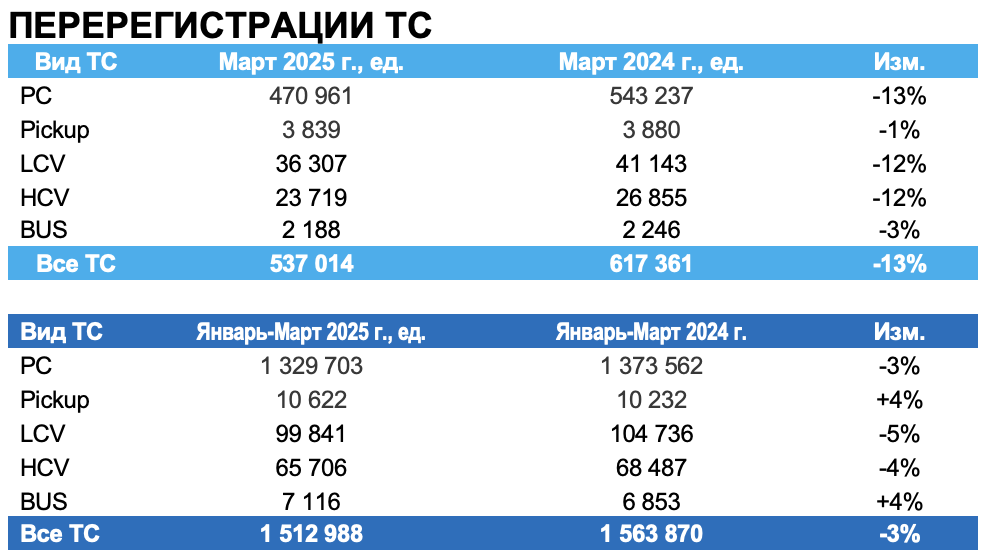 «Автостат Инфо» публикует данные о регистрациях новых транспортных средств и транспортных средств с пробегом на рынке России в марте 2025 года и за первый квартал текущего года.