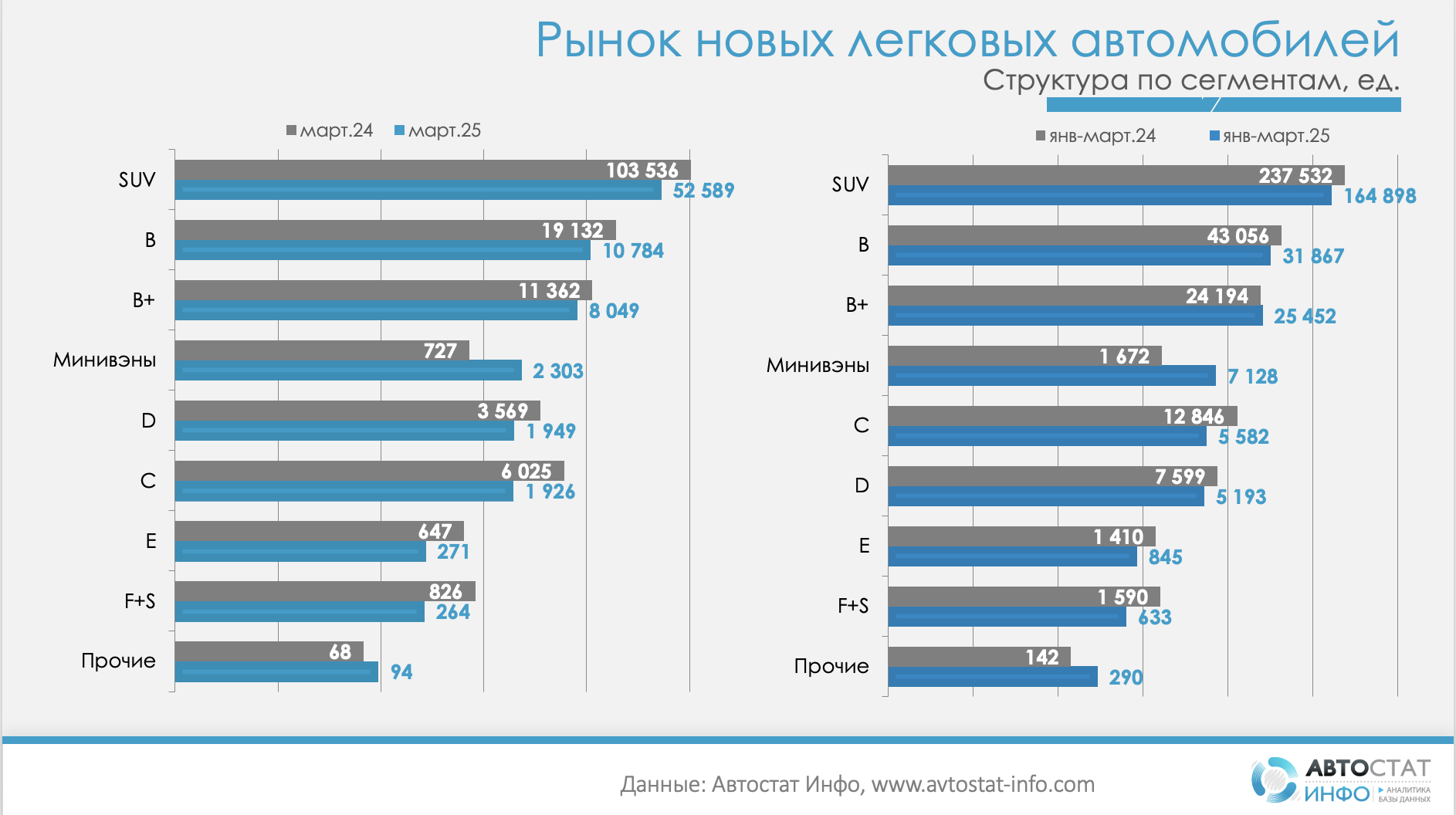 На 326% выросли продажи минивэнов — до 7 128 автомобилей. Продажи в сегментах C и D снизились на 56% (до 5 582 единиц) и 32% (до 5 193 единиц) соответственно, доля этих сегментов составила 2,3% и 2,1%.